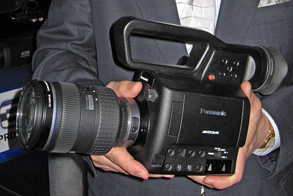 Noch nicht so weit entwickelt wie der Stereo-Camcorder, von dem es mehrere funktionsfähige Muster an verschiedenen NAB-Ständen gibt, ist dagegen derzeit der geplante Single-Sensor-Camcorder AG-AF100. Auch dieses Gerät soll in AVCHD auf SDHC-Karten aufzeichnen. Die Besonderheit ist der aus dem Fotobereich stammende, mit 4/3 Zoll für den Videobereich ungewöhnlich große Sensor. Der soll eine dem 35-mm-Film ähnliche, geringe Schärfentiefe ermöglichen. dank Wechselbajonett kann dieser Camcorder mit diversen Fotoobjektiven bestückt werden. Aufzeichnen soll der Camcorder unter anderem 1080p24, also auch hier die Anlehnung an den Filmbereich. Zum Preis wollte Panasonic noch nichts sagen, der Lieferstart sei noch für 2010 geplant.