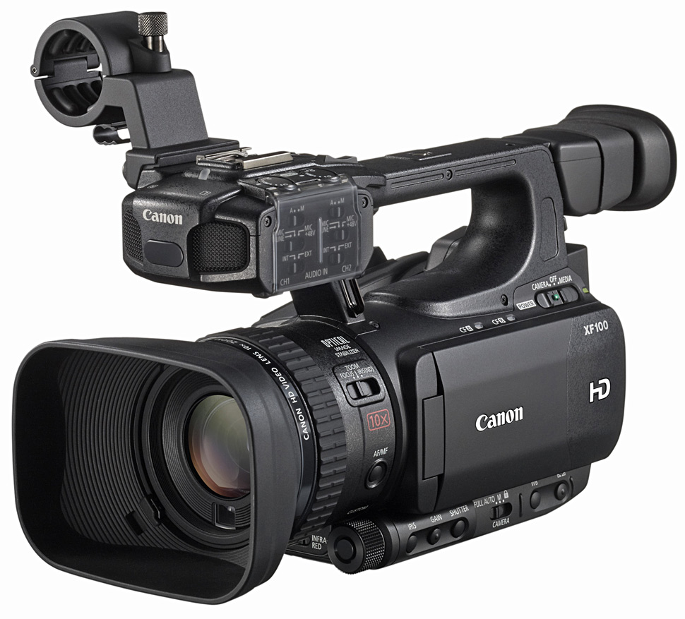 Canons XF 100 ist ein Single-Sensor-Gerät mit einem 1/3-Zoll-CMOS-Bildwandler, er speichert HD-Signale mit 1080 Zeilen als 4:2:2-Signale in MPEG-2 mit 50 Mbps auf CF-Speicherkarten. Signalverarbeitung und Codec entsprechen dabei laut Hersteller dem XF 300/305. Der XF 100 verfügt über einen Sucher und ein Ausklapp-Display, auch mit XLR-Buchsen kann er aufwarten. Vom neuen Camcorder soll es wie beim 300/305er zwei Versionen geben: den XF 105 mit Schnittstellen für Timecode/Genlock/HD-SDI und den XF 100 ohne.