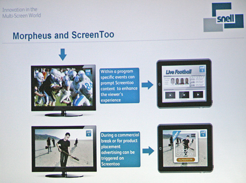 Snell geht bei seinen Produktneuheiten zudem auf einen weiteren wichtigen Trend ein: Immer mehr Anwender nutzen demnach mehrere Medien parallel. Während der Fernseher läuft, sind sie zusätzlich bei Facebook oder anderen Netzwerken eingeloggt und können über diesen »Second Screen« zusätzliche Infos abrufen. Snell hat hierfür gemeinsam mit »The Application Store« die Screentoo App entwickelt, die auf Morpheus basiert. Morpheus kann — vereinfacht gesagt — Metadaten in den Playlists verwalten und auf der Basis dieser Metadaten lassen sich auf die Second Screens automatisiert und synchron zum TV-Programm bestimmte Informationen ausgeben. Morpheus sorgt dabei dafür, dass beide Kommunikationskanäle synchron beschickt werden.