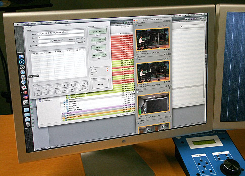 Was ist das Besondere an LiveCut? Die grundlegende Arbeitsweise des software-basierten Mac-Produktionssystems besteht darin, dass man während der Produktion einer Veranstaltung über einen klassischen Mischer den Live-Schnitt mit mehreren Kameras vornimmt. Die LiveCut-Software erfasst diese Schnitte und Überblendungen per GPI-Verbindung, gleichzeitig werden die einzelnen Kamera-Kanäle als Files aufgezeichnet.
