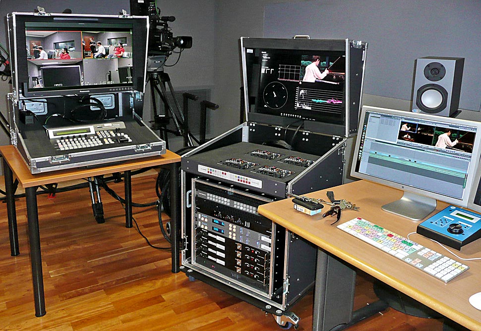 In der Regel werden die Mozarteum-Produktionen mit zwei bis vier Camcordern realisiert. Deren Signale werden intern auf Speicherkarten aufgezeichnet (AVC-Intra). Gleichzeitig liegen die Signale auch an einem Live-Mischer an. Die Kameras werden über eine CCU ferngesteuert und gematcht. Am Bildmischer wird nun wie bei einer Live-Übertragung aus den vier Kamerasignalen ein Sendesignal gemischt. Der Mischer ist über die LiveCut-Software von Tools On Air mit einem Rechner und einem Speichersystem verbunden und dort wird ein Multikameraprojekt erzeugt, das dem Ausgangssignal des Mischers entspricht. Es werden also alle Kamerasignale separat in ProRes aufgezeichnet und es wird ein Final-Cut-Projekt angelegt, dessen Timeline exakt der Bildmischung entspricht, die während der Aufzeichnung am Videomischer erzeugt wurde.