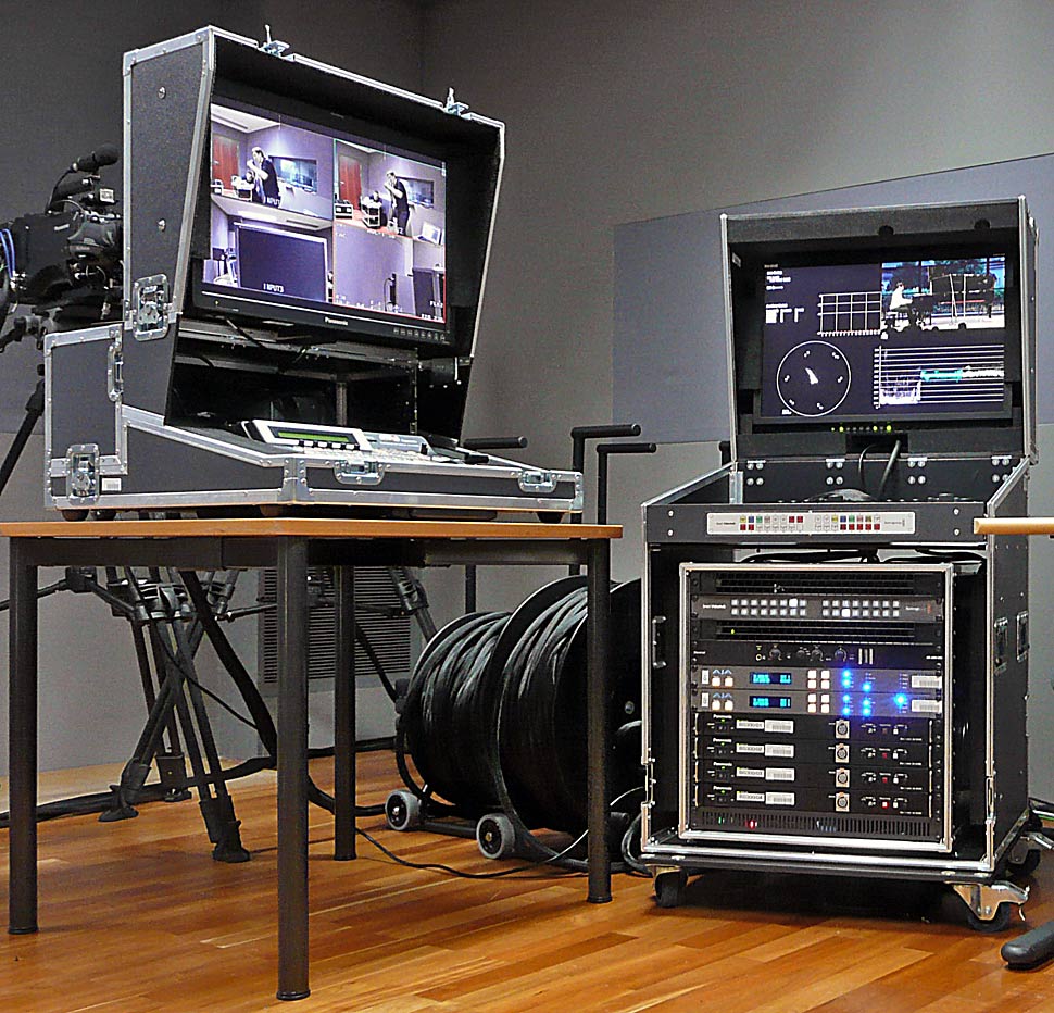 Da es beim Mozarteum mehrere Regien und Aufzeichnungsorte gibt, galt es, das LiveCut-Produktionssystem mobil zu machen. Zu diesem Zweck wurde ein Rack-Konzept entwickelt, das vier Einheiten umfasst: Ein Flightcase enthält den Mischer und im Deckel einen aufklapp- und auch separat nutzbaren Monitor. Ein mobiles Racksystem enthält die Kamerasteuerungen und den »Digital Glue«, also das komplette Modular-Equipment und die Basisstationen der Kameras. Das dritte mobile Rack enthält das Live-Cut-System. Das vierte zum System gehörende Rack ist im zentralen Geräteraum (ZGR) fest installiert, hier ist das Server- und Archivierungs-Equipment versammelt. Um die mobilen Racks rasch miteinander verbinden und in Betrieb nehmen zu können, nutzt das Mozarteum eine Multipin-Steckverbindung des amerikanischen Herstellers Wireworks, die auch HD-SDi-Signale verkraftet.