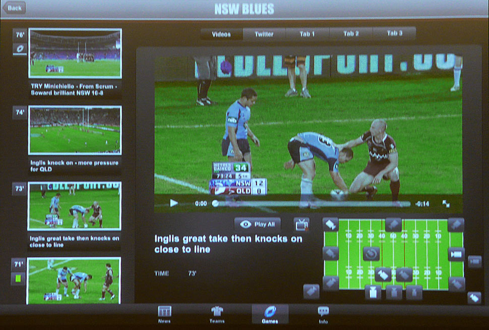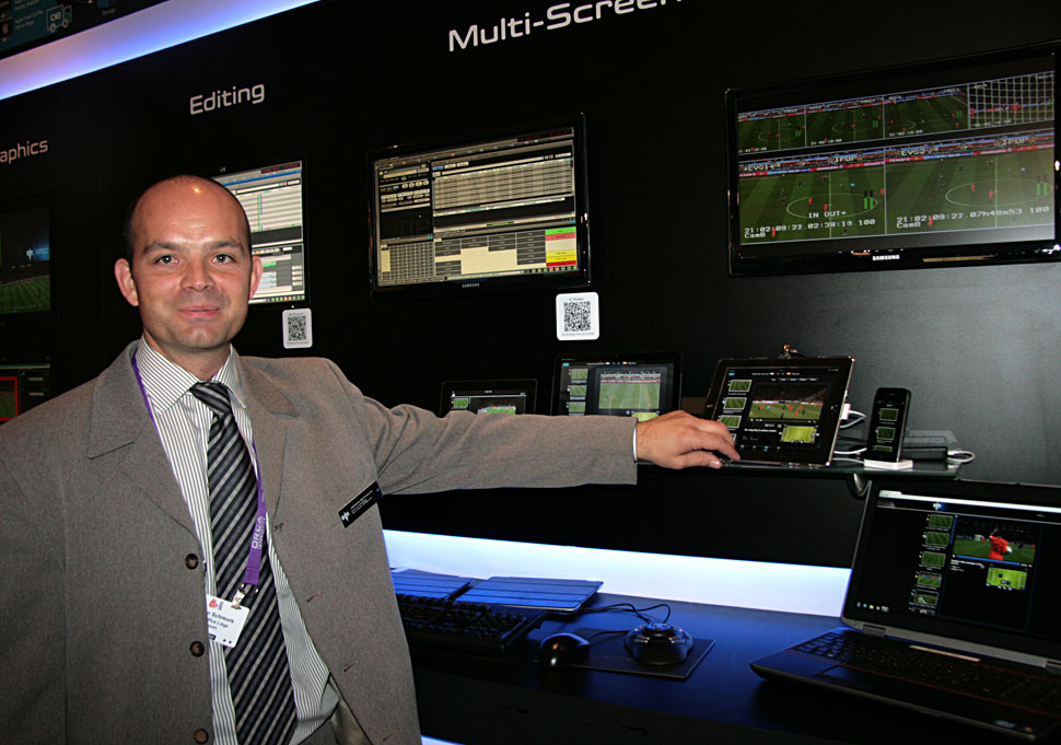 Spannend ist auch, wie sich EVS dem Thema nähert: Als neuen Teil seiner »Sports360«-Produktlinie hat EVS das Produkt C-Cast entwickelt. Dabei wird Live-Content auf Smartphones und Tablets gestreamt und gleichzeitig hat der Endkunde dabei die Möglichkeit, selbst Zeitlupenwiederholungen aus verschiedenen Kamerapositionen abzurufen, jederzeit nochmal die Highlights zu sehen und zu wiederholen. Klingt verrückt, funktioniert aber. Dazu werden die von EVS-Servern gespeicherten Feeds automatisiert für die Second-Screen-Distribution aufbereitet und stehen dem Zuschauer dann innerhalb einer übersichtlichen Browser-Oberfläche zur Verfügung.