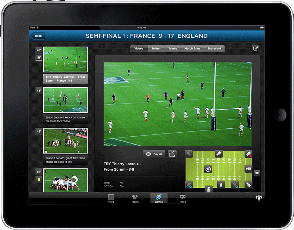 Einen ganz eigenen Ansatz verfolgt EVS. Dort hat sich aus einer ersten Idee, die im Rahmen der IBC vorgestellt wurde, mit dem Produkt C-Cast etwas ganz Konkretes entwickelt: Während der Fußball-Europameisterschaft werden Second-Screen-Nutzer darüber eigene Replays gerade laufender Spiele aus verschiedenen Kameraperspektiven abrufen können.