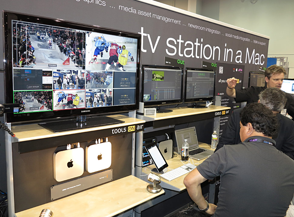 Fernsehsendungen können auch über iPhone- und iPad-Apps mit Rückmeldungen der Zuschauer versorgt werden, die wiederum direkt in die Sendung einfließen können, hier sind der Fantasie keine Grenzen gesetzt. In der »TV Station in a Mac«-Produktfamilie von Tools On Air etwa, gibt es nun die Software-Komponente JustSocial, die in Zusammenarbeit mit Molden Media und dem Tools-On-Air-Kunden Joiz entwickelt wurde: Einem TV-Moderator werden auf einem iPad Facebook-Kommentare und Tweets der Zuschauer angezeigt, die er dann ins laufende TV-Bild einblenden kann.