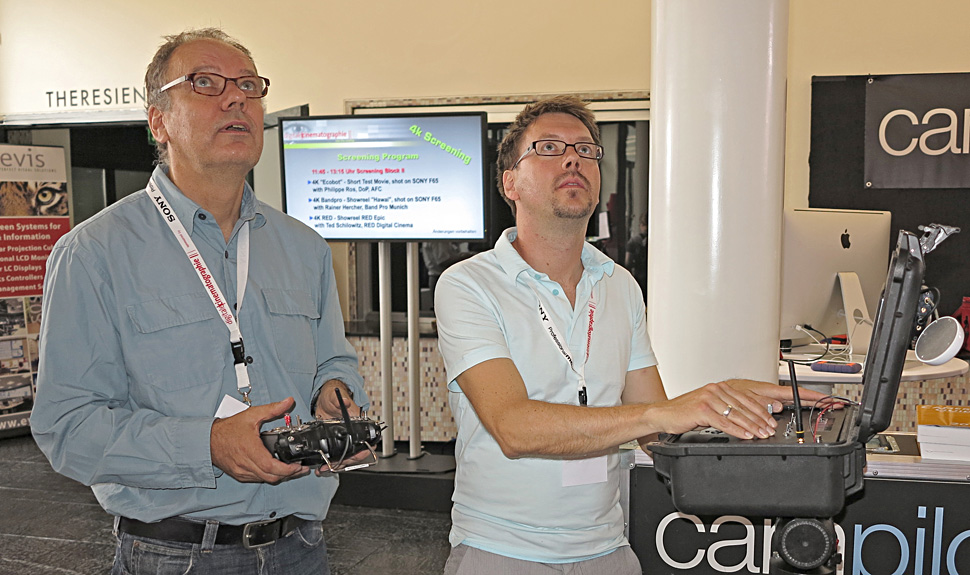 Auch im Kamerasupport konnten etliche neuere Systeme in Augenschein werden. Flammneu und als Premiere bei der Digitalen Cinematographie zu sehen: Cablecam von den Campilots. Technik und Erfahrungen aus dem Multikopter-Betrieb haben Holger Fleig und Volker Tittel zusammen mit dem Designer und Entwickler Dieter Wurster in ein neues, zusätzliches Produkt für die innovative Kamerabewegung einfließen lassen: An einem rasch zu installierenden Trageseil aus dem Bergsteigerbereich fährt dabei eine kreiselstabilisierte Laufkatze, die den gleichen Kamerakopf trägt, den die Campilots auch an ihrem Multikopter einsetzen.