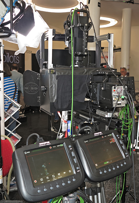 Olympus demonstrierte in Kooperation mit dem Rental-Anbieter Tectum ein Setup aus zwei Highspeed-Kameras des Typs i-Speed PL, die in einem Stereo-3D-Setup stereoskopische Slow-Motion-Aufnahmen aufzeichnen können. Die Aufzeichnung erfolgt dabei zunächst in den beiden Kameras, dann können die gewünschten Passagen markiert und in verschiedenen Formaten auf externe Speichermedien ausgegeben werden.