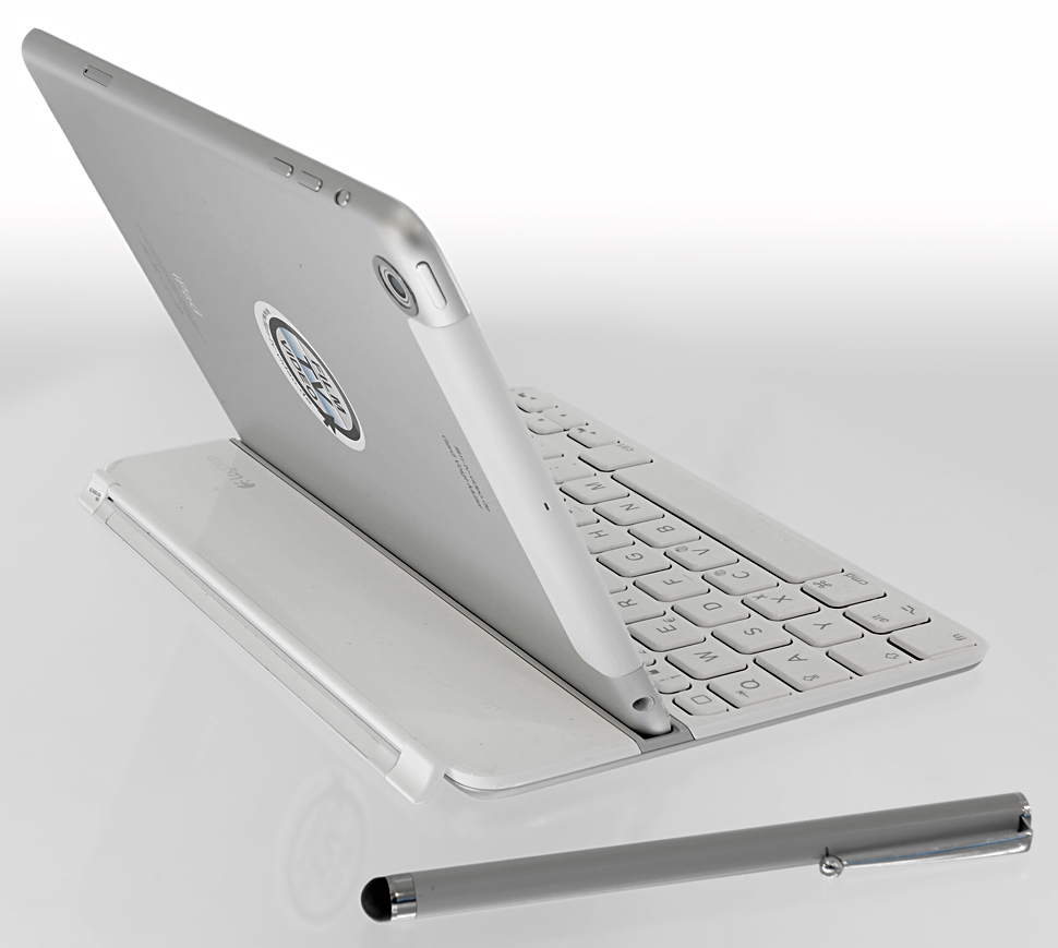 Beim mobilen Arbeiten auf dem Messegelände mit den den kleinen Tablets, hilft eine Bluetooth-Tastatur, die sich auch per Magnetscharnier als Deckel für das iPad nutzen lässt.