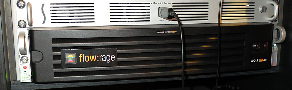 FlowRage ist in diversen Ausbaustufen erhältlich: ToolsOnAir bietet das NAS mit Kapazität von vier bis 126 TB in einem Chassis an. Das System erläubt die Anbindung unterschiedlicher Clients (Windows, Mac, Linux). Es ist als Raid5 oder Raid6 erhältlich, bietet 32 GB Standard Cache (skalierbar bis 256 GB) und wird je nach Ausbaustufe im 19-Zoll-Gehäuse mit zwei bis vier HE ausgeliefert. FlowRage ist mit austauschbaren 3,5-Zoll-Laufwerken (Enterprise Class) ausgerüstet. Die Backup-Software Archiware läuft ebenfalls auf dem System.