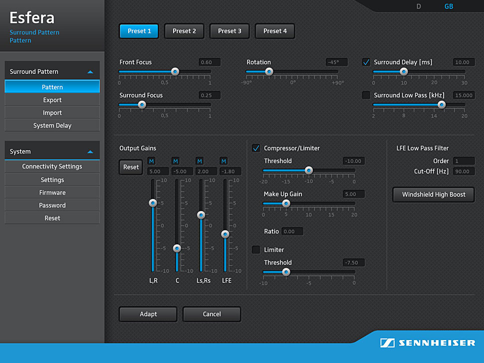 Die 19-Zoll-Prozessoreinheit von Esfera erzeugt über einen speziellen Algorithmus aus den Mikrofonsignalen ein vollständiges 5.1-Surround-Signal mit Sampling-Raten von bis zu 96 kHz. Ein eingebauter Kompressor sorgt für ein sendefreundliches Signal. Die Basiseinheit weist ein aufgeräumtes Design auf und bietet vier direkt anwählbare Presets. Die Presets können bei Bedarf über eine Ethernet-Schnittstelle modifiziert werden. Über die Software des Prozessors können dann zum Beispiel die Lautstärken (Gain) der Kanäle sowie der Front- und Surround-Fokus geändert, die Surround-Verzögerung bestimmt werden sowie Kompressor, Limiter und Höhenanhebung eingestellt und diverse Filter mit ihren Grenzfrequenzen gesetzt werden.
