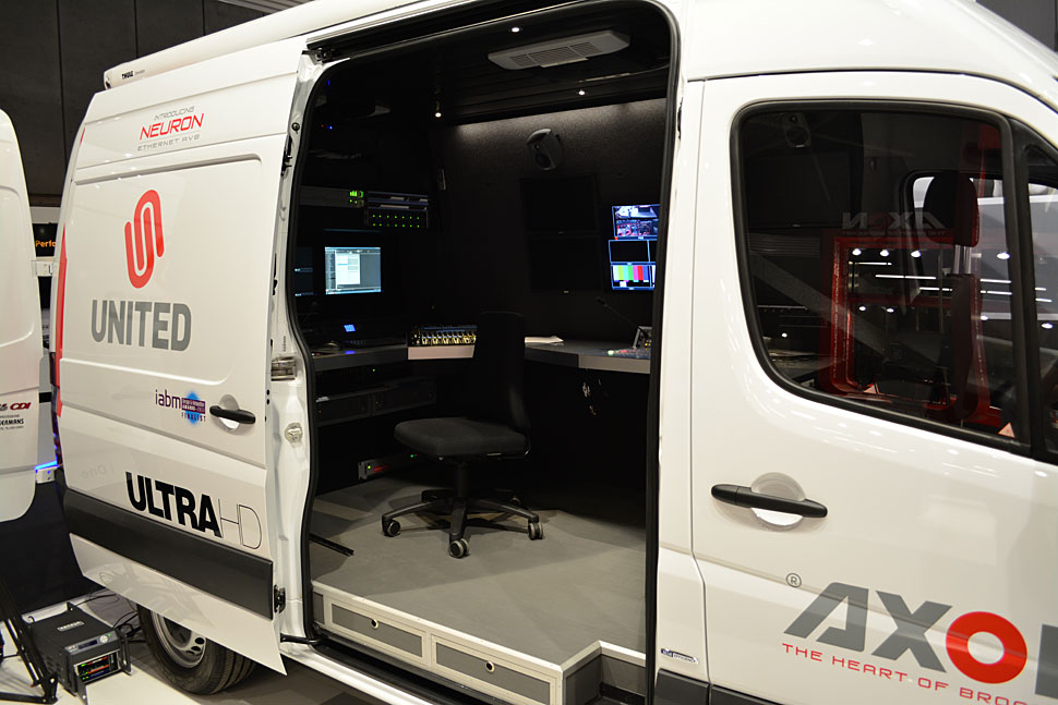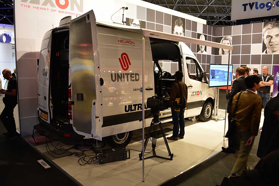 Axon präsentierte Neuron während der IBC2013 in einem SNG-Fahrzeug für vier Kameras. Axon hat das Fahrzeug für den niederländischen TV-Dienstleister United gebaut und mit Neuron ausgestattet. Dafür entwickelte der Hersteller ein spezielles Übertragungs-Modul und integrierte auch einen eigenen Mischer in das SNG-Fahrzeug. Es ist für die Produktion kleinerer Events konzipiert, und in diesem Bereich sieht Axon-Chef Jan Eveleens auch die besten Bedingungen, um AVB-basierte Übertragungen zu testen und zu realisieren.