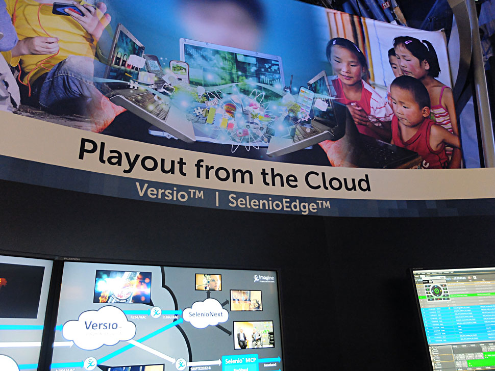 Im Fokus der Messe standen Lösungen wie etwa Versio, ein System, das die gesamte Funktionalität bietet, die man zum Playout eines TV-Kanals benötigt. Versio gibt es als Standalone-Gerät im 1-HE-Gehäuse, doch bei der NAB zeigte Imagine auch eine Software-Only-Variante des Systems — also sozusagen den Playout aus der Cloud.