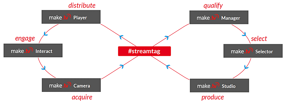 Make TV ist als cloud-basiertes Produktions-Tool für Live-Content konzipiert: Anstatt etwa bei einer Sportveranstaltung oder bei einer Konferenz jeweils vor Ort mit einer mobilen Regie oder einem Ü-Wagen ein fertiges Programm zu produzieren und dieses dann zu streamen, greift man bei Make TV via Internet auf Material aus unterschiedlichen Quellen zu und gestaltet daraus das Live-Programm in der Cloud. Als Quellen können Smartphones, Webcams, Live-Streams aus Camcordern, aber auch Zuspielungen oder im Web schon vorhandene Clips genutzt werden.