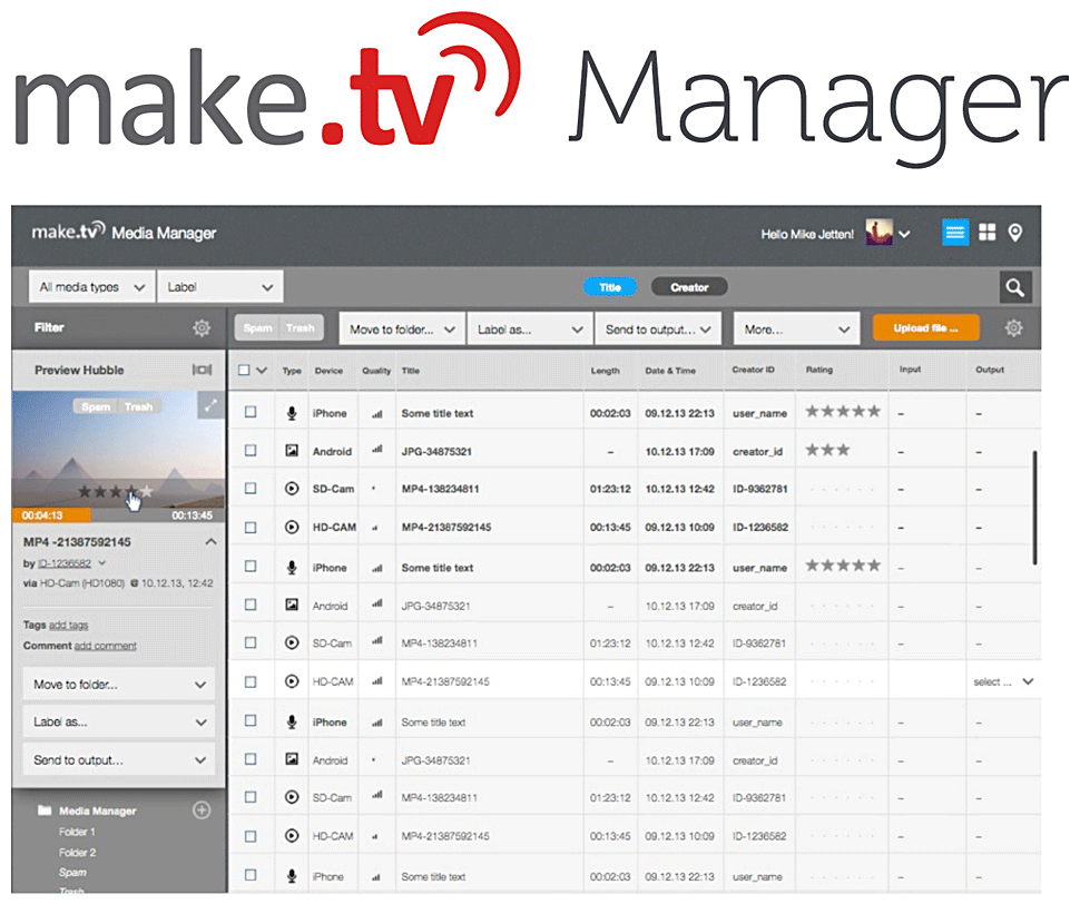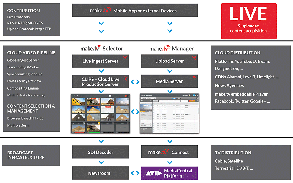 Make TV ist eine cloud-basierte Lösung, mit der sich Sendungen/Programme gestalten und verteilen lassen. Dabei kann Input aus verschiedensten Quellen in das System geholt, dort von den Programmgestaltern zusammengestellt und wieder auf verschiedensten Wegen an diverse Endgeräte verteilt werden. Die Programmgestalter können dabei dezentral operieren, also von verschiedensten Orten aus kollaborativ an einem Projekt arbeiten.