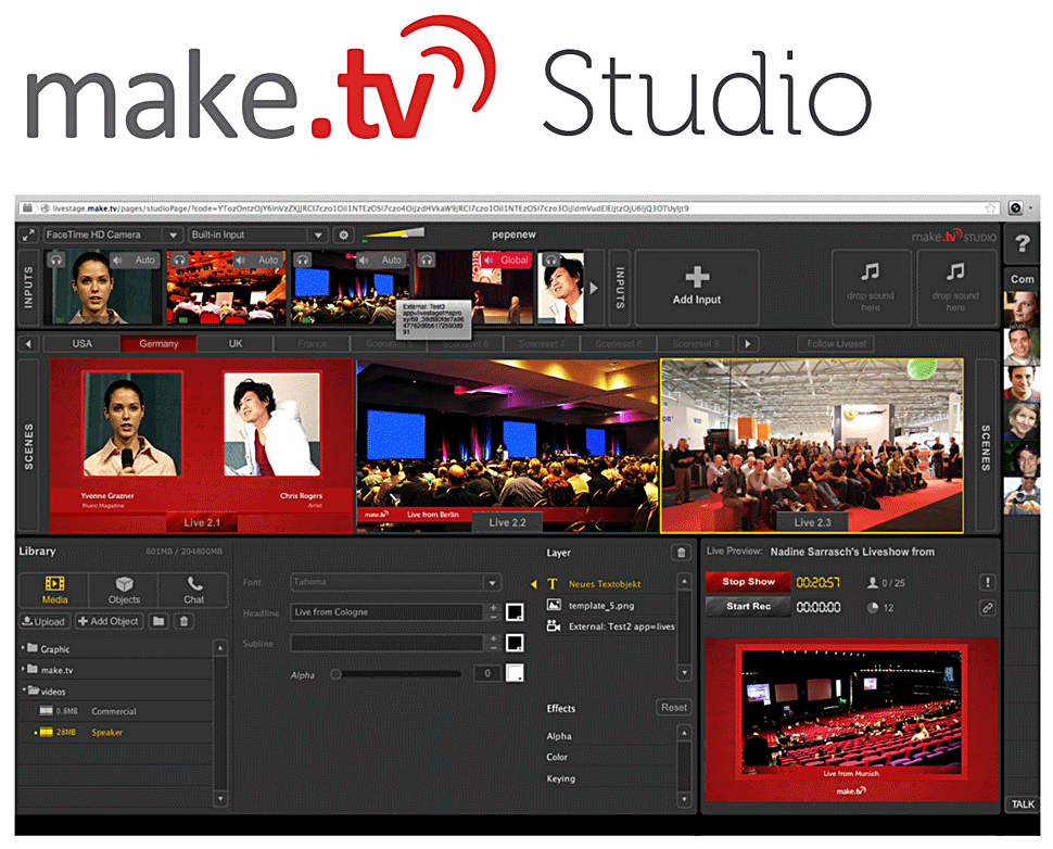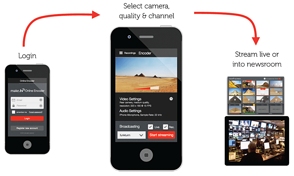 Die zentrale Komponente ist Make TV Studio: Das ist eine Applikation, die per Web-Browser genutzt wird. Man muss keine Software downloaden und installieren, sondern greift per Browser auf die Funktionalität zu. Um Smartphones und Tablets nutzen und einbinden zu können, gibt es Apps.