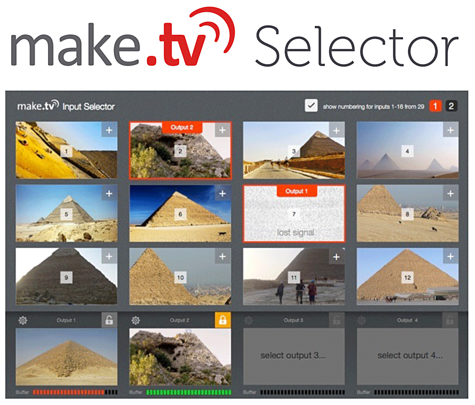 Eine weitere Ergänzung von Make TV Studio ist der Selector. Das ist sozusagen ein Multiviewer, mit dem man bis zu zwölf Live-Quellen gleichzeitig darstellen kann, die man per Filter oder individueller Auswahl aus einer quasi unbegrenzten Zahl von Quellen/Streams auswählen kann. Hier kann man wie bei einem Bildmischer auswählen, welche der angezeigten Quellen man ausgeben will: Entweder an Make TV Studio, aber (mit entsprechender Hardware) auch via SDI-Schnittstelle an andere Infrastrukturen, wie etwa Newsrooms oder Sendestrecken. Der Selector erfüllt also auch die Funktion, Handy-Streams zu stabilisieren und so aufzubereiten, dass man sie in klassischen Broadcast-Strukturen verarbeiten kann.