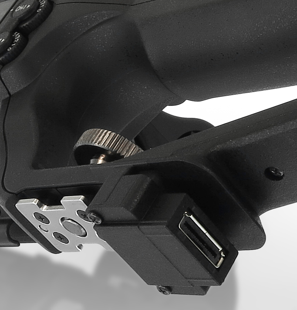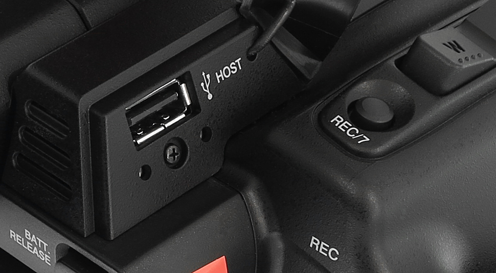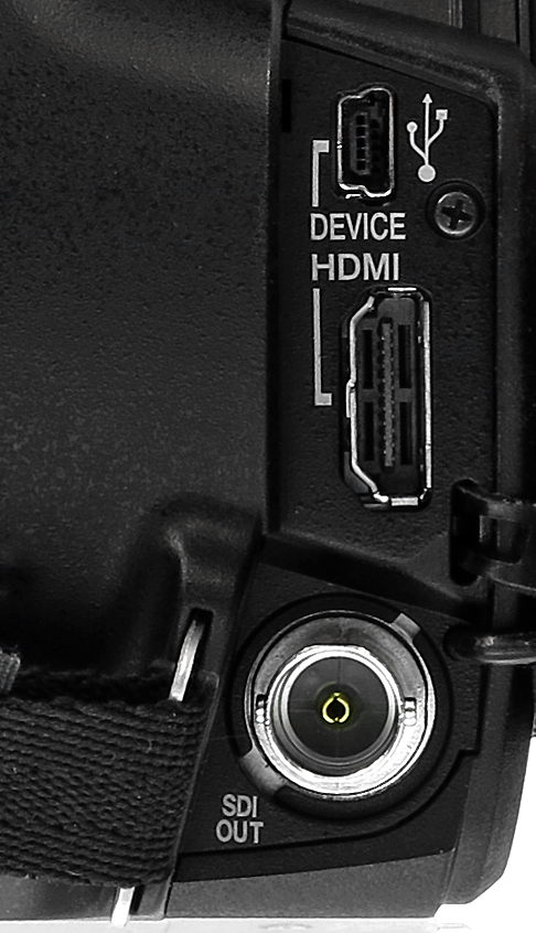 Als Schnittstellen stehen HD-SDI und HDMI 2.0 zur Verfügung, beide können gleichzeitig genutzt werden, außer bei UHD-Wiedergabe: Dann ist die SDI-Buchse deaktiviert. Ansonsten gibt es noch eine Host- sowie eine Device-USB-Schnittstelle, einen analogen AV-Anschluss sowie eine Kopfhörer und eine Aux-Buchse (jeweils 3,5 mm), eine Remote-Buchse und einen Gleichstromanschluss. Im Henkel stehen zwei XLR-Buchsen mit Phantomspeisung bereit.