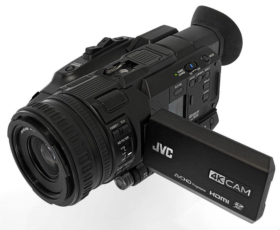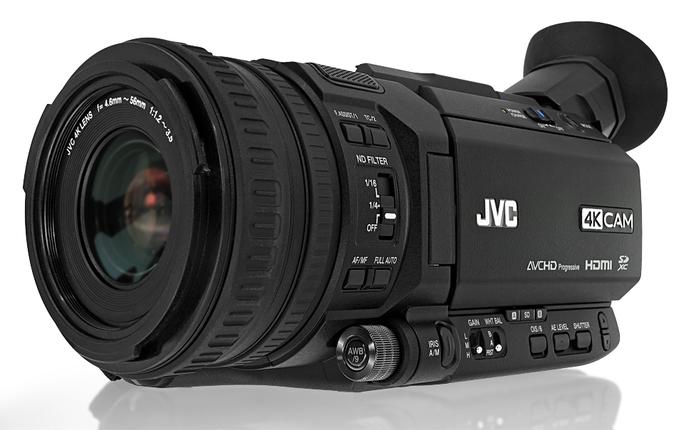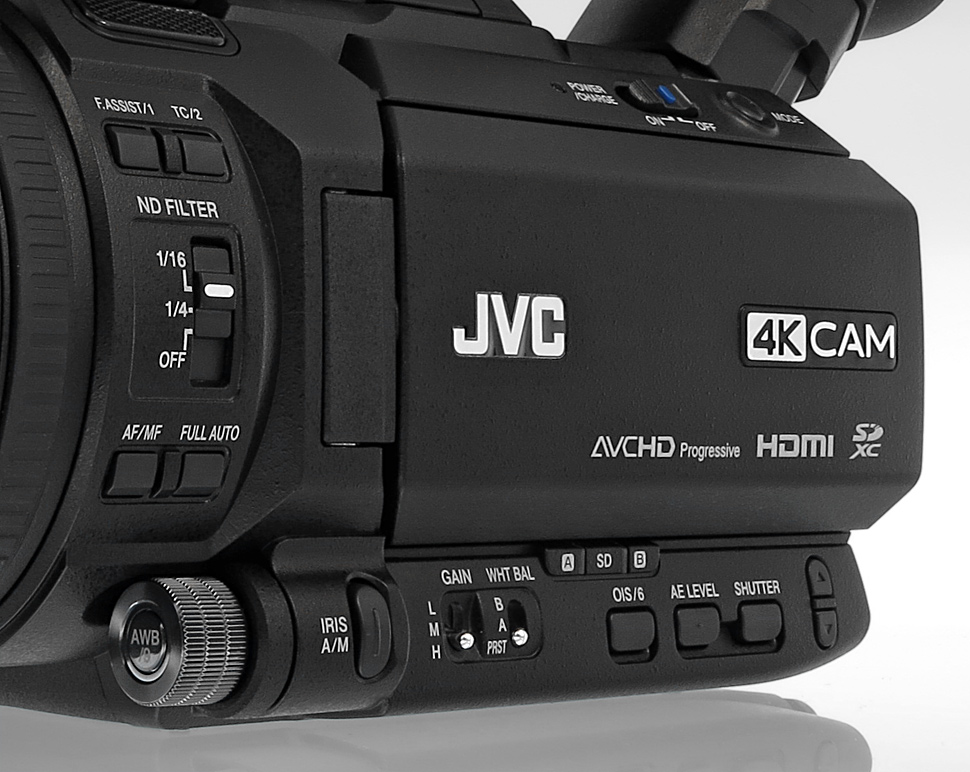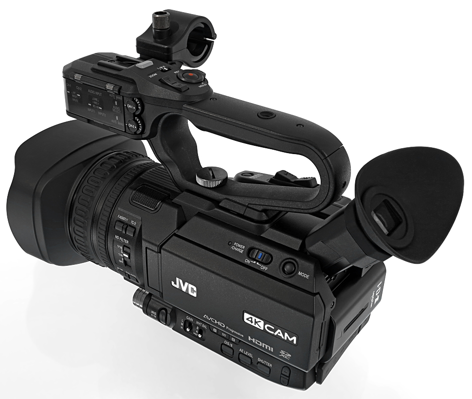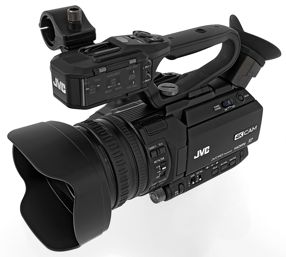 Der GY-HM200 ist ein kompakter 4K-Handheld von JVC mit fest eingebautem Objektiv und abnehmbarem XLR-Henkel. In HD bietet er 4:2:2-Aufzeichnung in 1080p50.