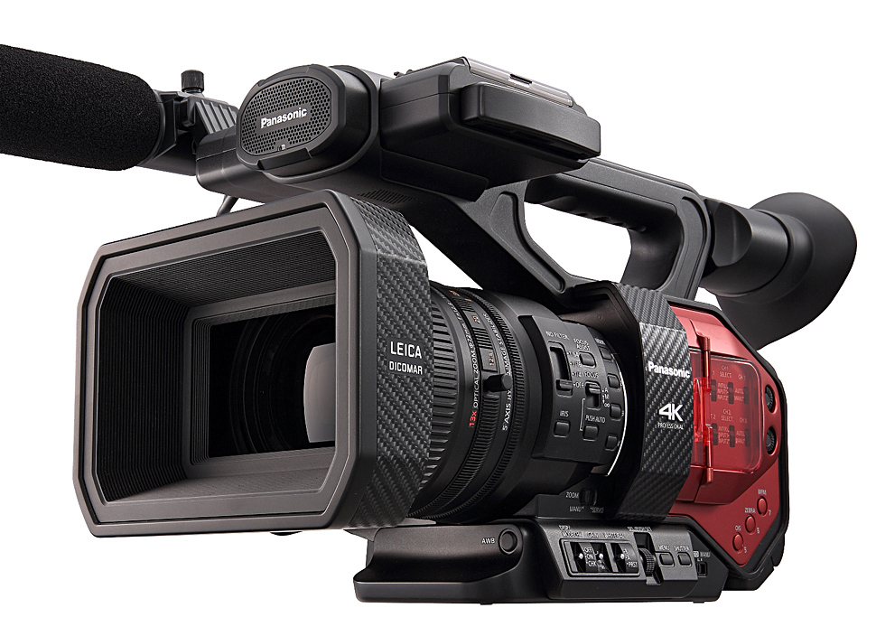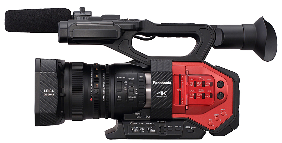 Der Camcorder verfügt über ein fest eingebautes 13fach-Zoomobjektiv mit drei Bedienringen und einer optischen Bildstabilisierung. Dabei handelt es sich um ein Leica Dicomar, das für 4K ausgelegt wurde und einen Anfangsöffnung von F2.8 bis F4.5 bietet (35-mm-Fotoäquivalent: 4K/24p: 29,5 mm bis 384,9 mm; HD: 28 mm bis 365,3 mm.)