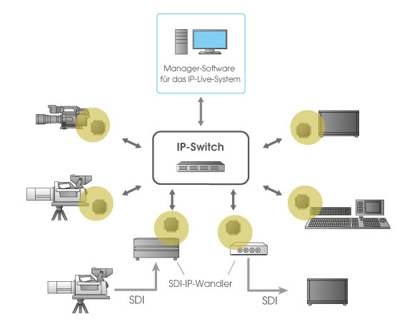 Das zweite Setup zeigt die Steuerung von Sonys AV over IP Interface mittels VSM. Durch die direkte Ansprache von Sonys System Manager mit VSM wird der Wechsel von Baseband auf IP-Netzwerke nahtlos und unmerklich für den Operator.