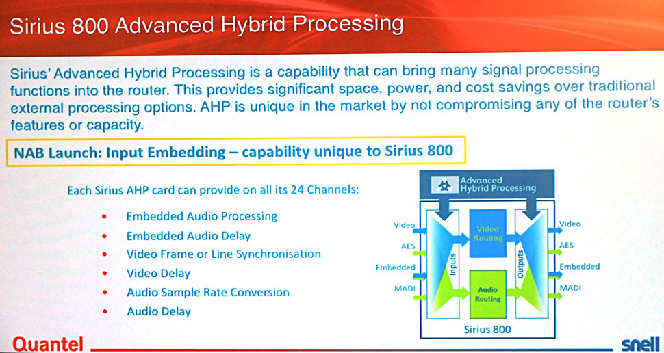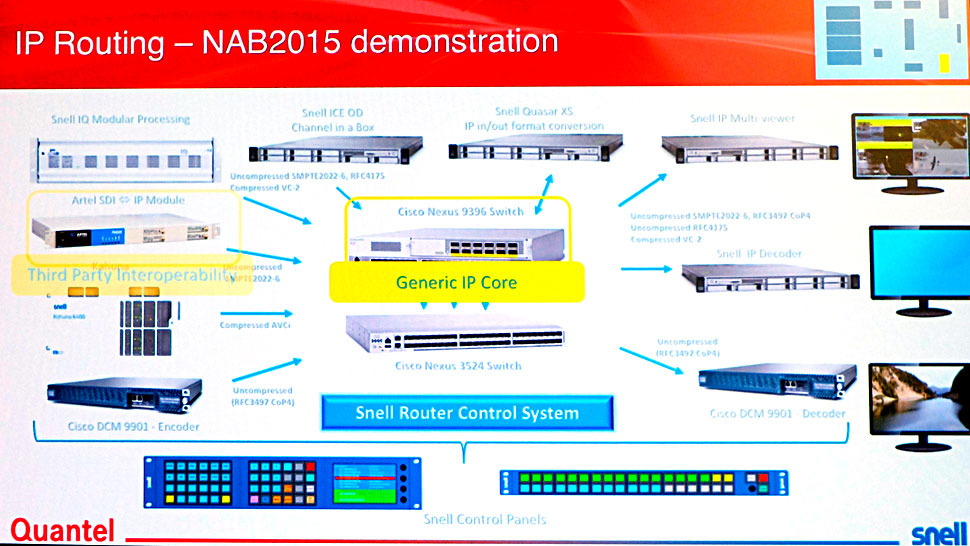 Am Gemeinschaftsstand von Quantel und Snell auf der NAB ist erstmals die reibungslose Zusammenarbeit von der Artel DigiLink-Plattform DLC 450 HD SDI und Snells IP-Routing-Lösung vorgeführt worden, die über eine IP-Schnittstelle ermöglicht wird. Diese Hersteller-übergreifende Kooperation ist ein Beispiel für eine Interoperabilität, die auf der Basis des SMPTE 2022-6 Standards erfolgt.