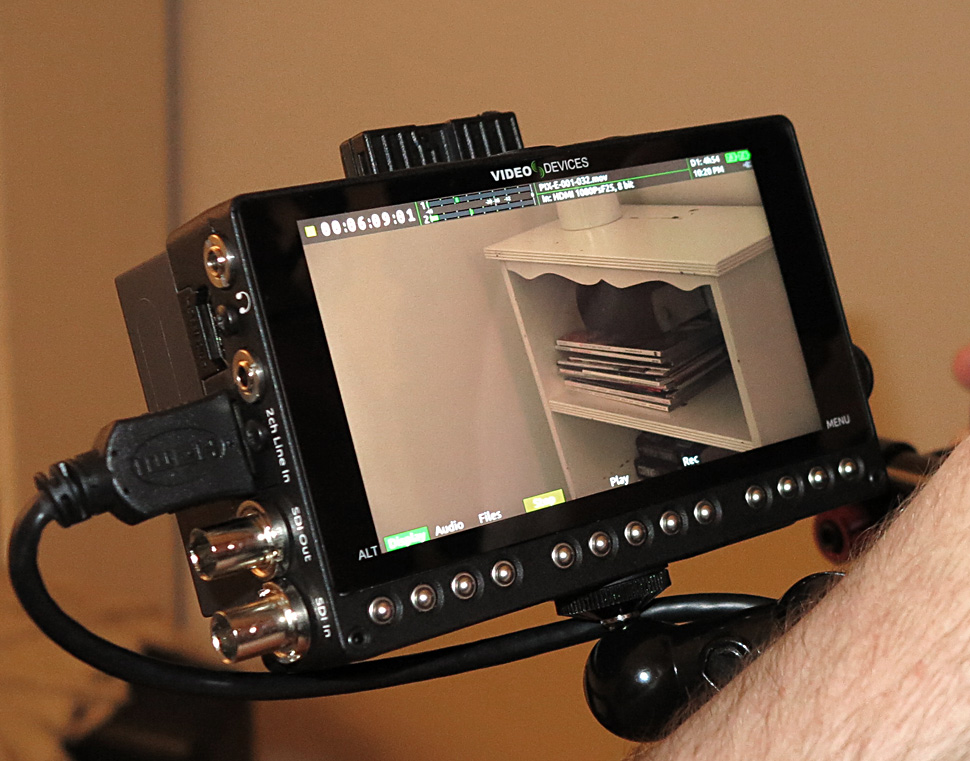 Neu bei dieser Messe: Der VJ zeichnet auf den Pix-E5 von Sound Devices auf, der gleichzeitig auch als On-Camera-Monitor für die C100 im Einsatz sein wird. Für die Aufzeichnung ist dabei ein Speichermedium von Sound Devices im Einsatz. Geschnitten werden die mit dem Camcorder aufgezeichneten Beiträge in diesem Jahr mit Adobe Premiere als NLE-System auf einem Mac-Laptop.