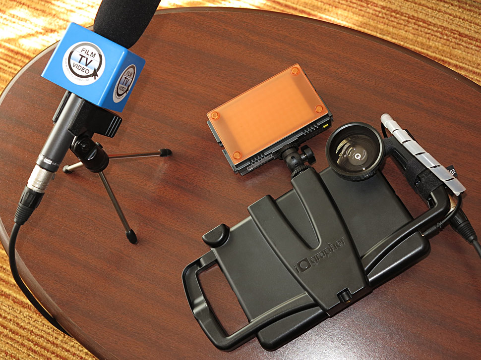 Eine Hardware-Ergänzung für das Filmen mit den iPads ist eine Halterung, in die sich die iPads einklicken lassen. Das von film-tv-video.de verwendete Produkt aus den USA heißt iOgrapher und glänzt weniger durch eine besonders hochwertige Ausführung, als durch einen günstigen Preis. Es handelt sich im Grunde um eine Plastikschale mit seitlichen Handgriffen und ein paar Befestigungsmöglichkeiten für Zubehör. Mit etwas Klettband und Moosgummi »gepimpt«, trägt einer der iOgrapher auch den im nächsten Abschnitt beschrieben Audio-Adapter iRig Pre.