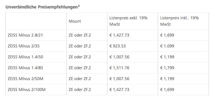 Die neue SLR-Objektivfamilie Zeiss Milvus ist als Begleiter für aktuelle DSLR-Kameras und auch für spiegellose Systemkameras der Sony α7 Serie via Adapterlösung konzipiert. Zeiss merkt zudem an, dass die Objektive mit ihrer hohen Kontrastwiedergabe und geringem Falschlicht modernste Videostandards wie HDR und Auflösungen von 6K und mehr schafften. Zeiss will die Milvus-Objektive ab Oktober ausliefern.