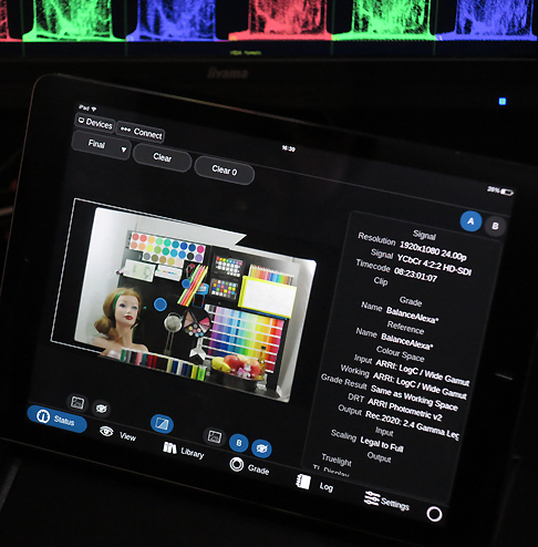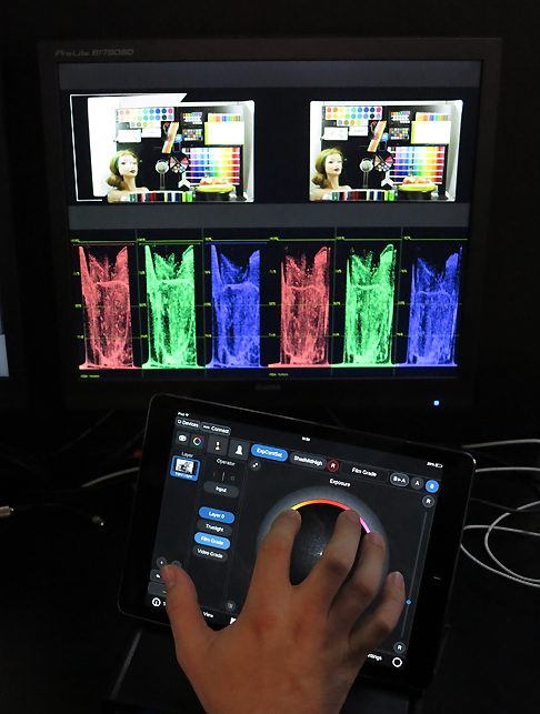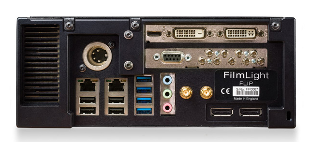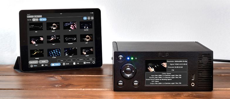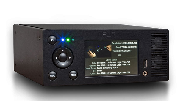 Basis des Setups am Filmlight-Stand war das System Flip, das Filmlight schon länger im Programm hat. Flip ist ein tragbarer Prozessor, der es ermöglicht, schon direkt am Set das Live-Kamerasignal so zu sehen, wie es später aussehen soll: Man kann damit zuvor kreierte Lookup Tables (LUTs), Filter und die ersten Ergebnisse von Grading-Sessions, auf das Kamerasignal anwenden und auch direkt am Set weiter mit diesen Werkzeugen am Look arbeiten. Dabei bleibt das Originalmaterial unverändert, aber die Vorarbeit, die am Set in puncto Grading und Look geleistet wird, bleibt erhalten und wird in Form von Metadaten mit dem Bildmaterial gespeichert. Flip holt sozusagen die kreative Look-Gestaltung ans Set und erlaubt die Kommunikation zwischen Postproduction und Set in puncto Farb- und Look-Gestaltung. Man kann mit Flip schon am Set genau sehen, wie das Material in der Post aussehen wird und man kann weitere Verfeinerungen vornehmen. Die Gedanken, Ideen und Vorstellungen, die Regie und DoP am Set entwickeln, können so die Basis des finalen Gradings bilden.