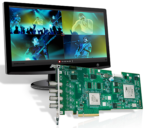 Ein weiteres Produkt von Matrox ist VS4 Recorder Pro. Das ist eine Software, die es in Verbindung mit einer I/O-PC-Steckkarte von Matrox (VS4-Quad-HD-SDI) erlaubt, vier Live-Videoquellen in NLE-kompatiblen Formaten aufzuzeichnen. Bildgenaues Multichannel-Recording auch von unsynchronisierten Quellen ist damit möglich. Darüber hinaus bietet VS4Recorder Pro gleichzeitig auch Multiviewer-Funktionalität und viele weitere Features, die auch den Einsatz in den Bereichen Überwachung und Archivierung erlauben.