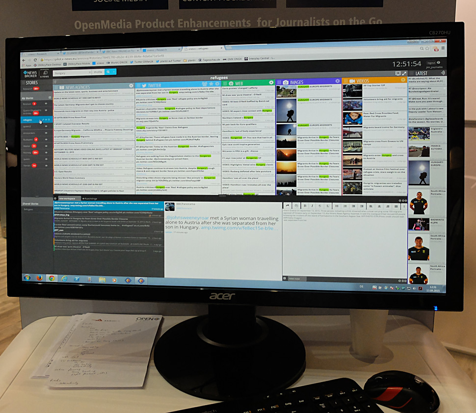 Die Besonderheit des Recherche-Moduls News Broker besteht darin, dass es nicht nur die Agentur-Feeds anbietet, sondern auch andere Informationsquellen lesen und übersichtlich darstellen kann: Social Media, diverse Web-Plattformen, sowie weitere Text-, Bild- und Videoquellen lassen sich anzeigen, durchsuchen, markieren und kombinieren. Dann kann die Materialsammlung an OpenMedia übergeben und dort weiter verarbeitet werden.