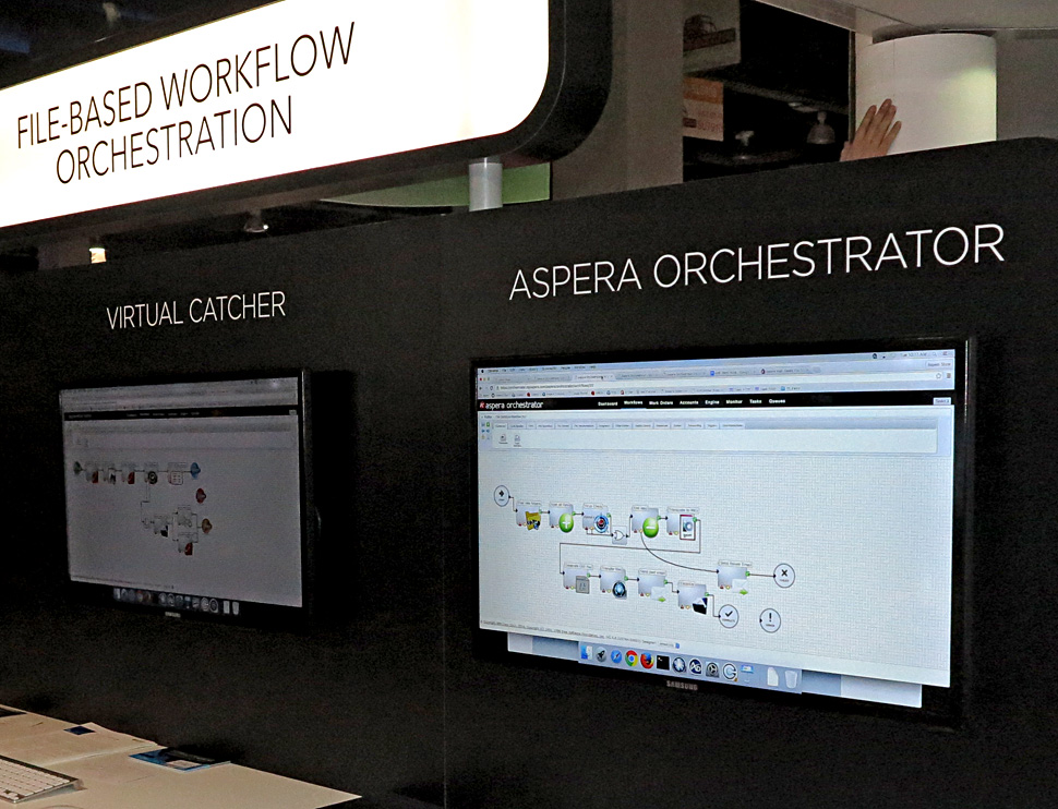 François Quereuil beschreibt aktuelle Entwicklungen: die Aspera-Software für die schnelle Übertragung von Media Files ist mittlerweile bei vielen Partnern in deren Produkte installiert, etwa bei Avid Interplay oder der QC-Software Interra Baton. Zudem kann sie auch als Ersatz einer klassischen Satellitenübertragung genutzt werden – per Faspstream Software Line.