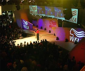 Die großen Unternehmen jeder Branche präsentieren sich auf der jeweils wichtigsten Branchen-Messe stets mit einigem Aufwand. Das ist auch bei den Figaros so, die im Rahmen der Hair World auch die Weltmeisterschaft der Friseure austragen. Eine ganze Halle hatte Wella auf dem Berliner Messegelände gemietet, um dem Fachpublikum Trends und Produkte aus der Welt der Haarpflege und Kosmetik zu präsentieren. Das mediale Konzept hierfür entwickelte die Firma Vidco aus Dreieich.