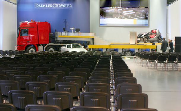 Technical Manager Christian Rehberg von der DaimlerChrysler tv.media GmbH, erarbeitete im Zusammenspiel mit den Stuttgarter Firmen Mevis.tv und Wireworx das Konzept für die Verlegung und die neue Installation der Technik, mit der das Studio auch völlig neu aufgestellt wurde. »Bautechnisch gab es einige Herausforderungen, so etwa die akustische Trennung der Studios voneinander, so dass man tatsächlich in beiden Studios gleichzeitig unabhängig voneinander produzieren kann. Trotzdem sollte eben die Möglichkeit bestehen, aus den beiden Hälften auch ein großes Studio kombinieren zu können,« erläutert Christian Rehberg. 730 Quadratmeter hat das kombinierte Studio, bei Bedarf kann locker ein ganzer Truck an der Stirnwand stehen, was auch regelmäßig passiert, denn im Rahmen von Akubis finden auch Lkw-Schulungen statt.