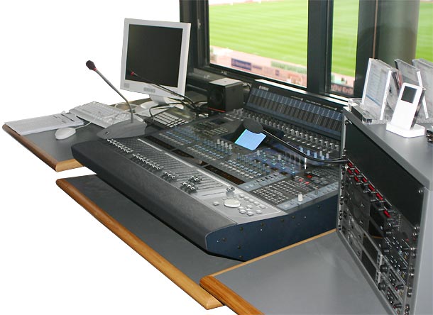 Nebeneinander und mit Blick aufs Spielfeld sind im Stadion drei der medientechnischen Arbeitsräume angeordnet. Einer davon beherbergt die separat vom restlichen Studio betriebene und von Siemens realisierte Beschallungszentrale mit einem großen Audiomischer. Daneben befindet sich der Video-Live-Platz mit Monitoren, Kamerasteuerung, Video- und Audiomischer sowie einer XDCAM-Maz. Abgetrennt daneben liegt der Videoregie/Grafik-Raum, von dem aus die Videowände versorgt und gesteuert werden. Hier sitzt während der Produktionen der Ablaufregisseur und hier steht das Grafiksystem Duet LEx von Chyron, mit dem Grafiken und Titeleinblendungen realisiert werden. Außerdem befinden sich in diesem Raum zwei identisch bestückte Racks mit der Steuerungstechnik für die Bildwände.