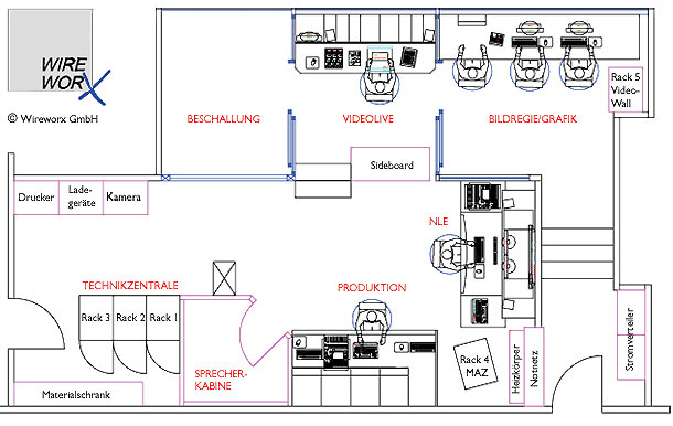 Die Planer Jürgen Kössinger und Rainer Kampe von Wireworx resümieren: »Die Raumaufteilung und ein Großteil der Studiomöbel wurden beibehalten, denn beides hatte sich bewährt: Schließlich machen die hier Beschäftigten schon seit zehn Jahren Programm, wissen, was sie brauchen und wie sie arbeiten wollen. Dennoch war die Umsetzung eine Herausforderung, weil eben die gesamte Technik ausgetauscht und völlig neue Systeme so kombiniert werden mussten, dass der eingespielte Workflow weit gehend erhalten blieb, aber auch neue Möglichkeiten eröffnet wurden.«