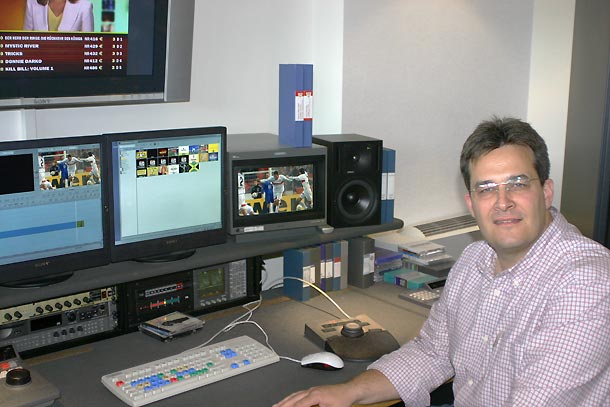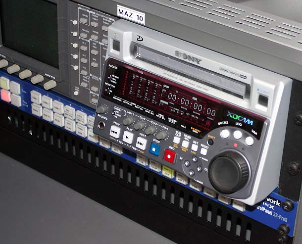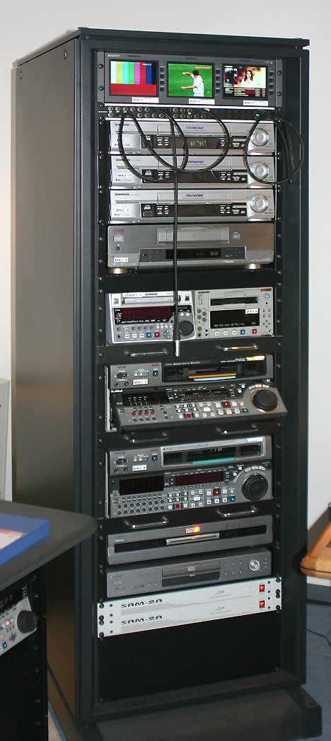 Zwischen NLE- und Produktionsplatz steht ein fahrbares Rack, in dem Recorder in den Formaten VHS, DV, DVCAM, XDCAM und Digital Betacam montiert sind. Über eine Kreuzschiene sind diese mit der restlichen Technik verknüpft, zu der auch Wandler und Server gehören. Gert Laabs erläutert: »Aktuell produzieren wir eigentlich nur noch auf XDCAM. In diesem disc-basierten Format haben wir drei Recorder und einen Camcorder angeschafft. Mit diesem Equipment sind wir sehr zufrieden und es gab bisher keinerlei Probleme damit. XDCAM beschleunigt unsere Arbeitsprozesse und läuft perfekt an unserem Schnittsystem. Mit dem neuen Digi-Beta-Recorder können wir aber auch weiterhin Bänder der Betacam-Familie wiedergeben, etwa auch unsere Betacam-SP-Archivbänder. DV und DVCAM können wir ebenfalls problemlos verarbeiten.«