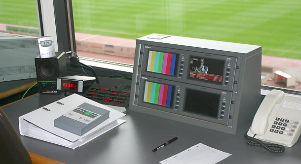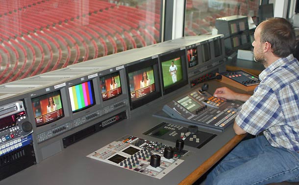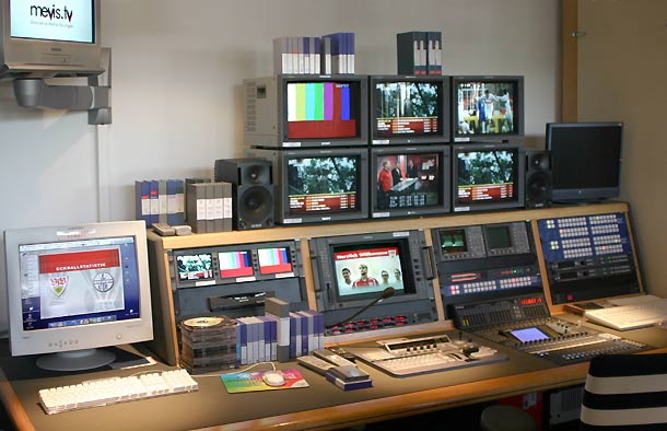 Studioleiter Laabs erläutert: »Die Betreiber/Nutzer-Konstruktion klingt für Außenstehende vielleicht ein bisschen kompliziert, diese eingespielte Lösung hat sich aber schon über viele Jahre bewährt. Viele Leute denken, dass wir im Studio des Gottlieb-Daimler-Stadions die Fußball-Übertragungen produzieren. Das tun wir aber nicht, denn die TV-Übertragung wird, wie in anderen Stadien, auch in Stuttgart von Ü-Wagen-Betreibern realisiert, die damit jeweils von den Fernsehsendern beauftragt werden. Wir produzieren dagegen ein eigenes, völlig unabhängiges Programm, das auf den großen Videowalls im Stadion läuft und bis zu drei weitere Programme, die auf den Monitoren im Business-Bereich des Stadions zu sehen sind.« Rund 260 Bildschirme in den Logen und im Foyer zeigen dieses stadioneigene Programm.