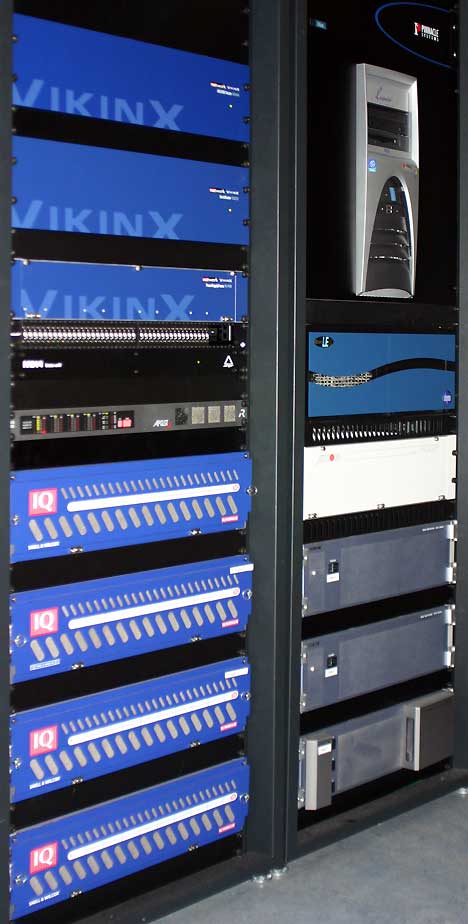 Für die A/D- und D/A-Wandlung von Audio- und Videosignalen sind im Stadionstudio Geräte aus der IQ-Baureihe von Snell & Wilcox im Einsatz. »Im Video-Processing setzen wir Equipment von Snell & Wilcox ein, auch die Glasfaseranbindung von Ü-Wagen an das Stadionstudio und die Bildformatkonversion von 4:3 auf 16:9 ist mit Geräten dieses Herstellers realisiert. Weitere Snell & Wilcox-Module kommen bei der Frame-Synchronisierung und beim Monitoring zum Einsatz,« erläutern die Planer Rainer Kampe und Jürgen Kössinger.