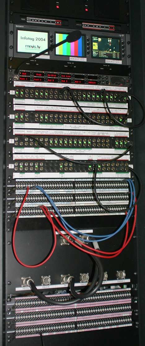 Insgesamt liegen knapp 30 km Kabel in der Decke des Studios, die Geräte sind überwiegend per SDI miteinander verbunden, die Mehrzahl der Monitore erhält ein FBAS-Signal. »Die XDCAM-Geräte und der NLE-Platz sind auch per Gigabit-Ethernet vernetzt. Eine Besonderheit stellt der Anschluss der Computer-Displays am NLE-System und am Grafikplatz dar: Weil die Rechner abgesetzt im Technik-Rack montiert sind, haben wir hier Glasfaser eingesetzt, um die erforderlichen Kabellängen zu ermöglichen. Wir gehen von DVI auf Glasfaser und dann wieder auf DVI,« erläutert Rainer Kampe von Wireworx.