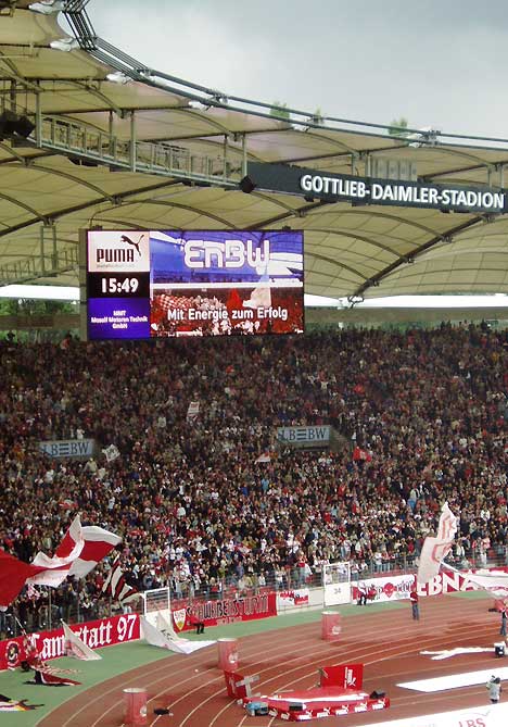 Wenn die Ballkünstler auf dem Rasen einlaufen, hat das Stadion-TV-Programm im Stuttgarter Gottlieb-Daimler-Stadion längst begonnen: Auf den beiden Riesenleinwänden in der Cannstatter und der Untertürkheimer Kurve der Fußball-Arena sowie auf rund 260 Bildschirmen in den Logen und Foyers im »Business«-Bereich wurde das Publikum schon mit der »Puma Soccer Show« auf das anstehende Spiel eingestimmt – und die gezeigte Werbung hat schon Geld in die Kassen des Bundesliga-Clubs VfB eingespielt.
