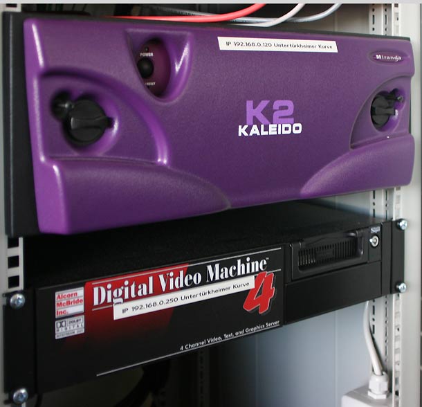Natürlich könnte man so etwas heute fast komplett mit Computertechnik realisieren. Warum das im EnBW-Stadionstudio nicht so gemacht wird, erläutert Studioleiter Gert Laabs so: »Wir brauchen natürlich eine gewisse Havarie-Sicherheit und müssen Ausfallrisiken verteilen. Deshalb setzen wir in etlichen Bereichen auf »Dedicated Hardware«, wo man das – rein technisch gesehen – vielleicht auch anders realisieren könnte. So teilen wir die Videowände mit jeweils einem Kaleido-K2-Splitter von Miranda in die einzelnen Felder auf und spielen die Loops für die kleinen Fenster mit zwei separaten MPEG-Playern zu: etwas aufwändiger, aber sicher.«