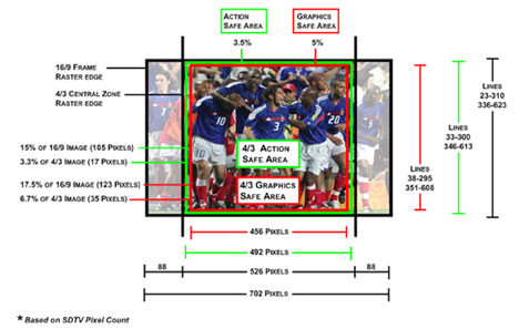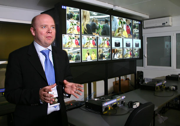 HBS-Chef Francis Tellier verschweigt bei der Formatdiskussion nicht, dass die Produktion der WM für die Kameraleute keine ganz einfache Aufgabe ist: Sie müssen 16:9 Bilder einfangen, sollen dabei aber den 4:3-Ausschnitt berücksichtigen – denn auch wenn HBS in 16:9 und HD produziert, wird die Mehrzahl der internationalen Sender ein 4:3-Signal verwenden. Alle spielentscheidenden Szenen müssen also innerhalb dieses 4:3-Ausschnitts stattfinden- – die Kameraleute werden auf Ihrem Monitor daher auch einen 4:3-Cache sehen. Auch die Grafiken sollen innerhalb dieses 4:3-Ausschnitts platziert werden, ebenso grafische Spielanalysen. Soweit die Theorie: Bei den Grafiken klappt das wahrscheinlich realtiv problemlos, beim Spielgeschehen darf man gespannt sein. Die Entscheidung von ARD und ZDF für das von der HBS gewählte 16:9-Seitenverhältnis ist hierbei zweifellos die sicherere Miete, denn es geht ja nicht nur um die Kameraeinstellungen, sondern auch um die Arbeit am Bildmischer. Dort wird garantiert mit 16:9-Bildern gearbeitet – und das wird man den Bildfolgen auch ansehen.