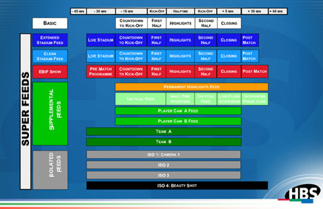 Wie bei der Produktion des Confed Cups will HBS auch bei der WM im kommenden Jahr ganz generell auf ein Produktionskonzept setzen, das sich schon bei der WM in Korea/Japan bewährt hatte: Es sieht die Produktion von Basic Feeds vor (BIF, Basic International Feed), die allen Sendern zur Verfügung stehen. Zusätzlich produziert HBS noch Super Feeds, also weitere Signale unterschiedlichsten Inhalts. Diese Super Feeds stehen jenen Sendern zur Verfügung, die entsprechende Rechte erworben haben. Im Unterschied zur WM 2002, wo es die Super Feeds lediglich im Komplettpaket gab, wird es den Sendern bei der WM 2006 möglich sein, einzelne Super Feeds individuell zu ordern und zu nutzen. Das hat viele Vorteile: Kleiner Sender, die sich keine oder nur eingeschränkte eigene Berichterstattung leisten können, haben etwa dank der EBIF-Show Zugriff auf ein hochwertig produziertes Komplettprogramm. »Theoretisch können Sender von der WM eine vollwertige Berichterstattung liefern, ohne ein einziges Team nach Deutschland zur WM zu schicken«, meint Dominik Schmid, Executive Director des Vermarkters Infront. Größere Broadcaster wiederum können sich dank des Multifeed-Konzepts von HBS auf die Produktion national relevanter Beiträge konzentrieren, weil sie bei den Multifeeds schon aus einer Vielzahl hochwertiger Bilder wählen können.