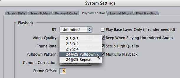 Auch im PAL-Workflow möchte man sein 24P-Material auf einen angeschlossenen Videomonitor ausgeben. In Final Cut Pro 4 war dies leider noch nicht möglich aber mit der verwendeten Version 4.5 erfolgte die Ausgabe über ein so genanntes 24@25-Verfahren, bei dem jedes 24ste Bild doppelt gezeigt wird. Leider verursacht dieses doppelte Bild auch ein kurzes Bildzucken, so dass in Version 5 von Final Cut Pro eine weitere Möglichkeit integriert wurde: Hierbei werden zunächst 12