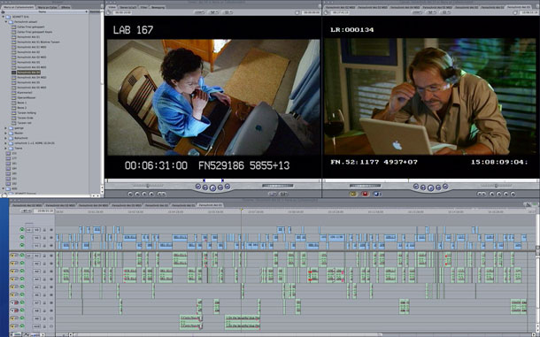 Nein. Den Tonschnitt habe ich abgegeben. Ich habe den O-Ton als OMF-Dateien exportiert und an die O-Ton-Cutterin Jutta Busch-Tomala übergegeben, die das Ganze mit ProTools weiterverarbeitet hat. Das Sound-Design wurde von unserem Sound-Designer Kai Tebbel ebenfalls in Pro Tools gemacht. Die Musik komponierte Helmut Zerlett in Logic Pro, womit man ja auch eine Videoanzeige und -ausgabe verwenden kann, um Musik und Töne auf Bild anzulegen.