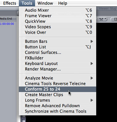 Final Cut Pro war in der Version 4 noch nicht in der Lage, eine 24p-Timeline als EDL mit 25 fps auszugeben. Seit Version 4.5 ist es jedoch möglich, eine 24p-Timeline mit einer 24@25-Zeitbasis zu versehen. Dieser 25-fps-Timecode, kann dann auch als 25-fps-EDL ausgegeben werden und wird vom Kopierwerk akzeptiert.