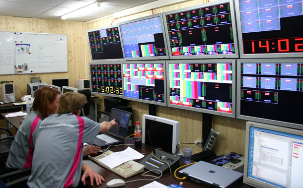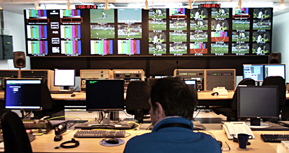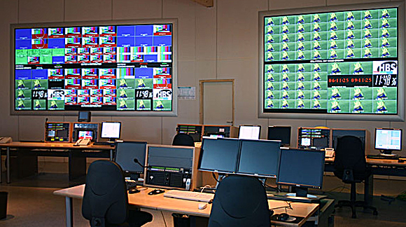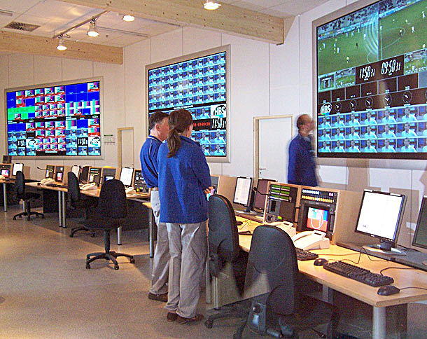 Auf sechzehn 70-Zoll-Multi-Screens werden im Master Control Room alle aus den Stadien ankommenden Signale überwacht, kontrolliert und verteilt. Es sind bis zu 144 SD-Feeds und 18 HD-Feeds gleichzeitig, die im MCR überwacht, weitergereicht und dann von den einzelnen Sendern weiter verarbeitet werden, bevor sie dann wieder via Satellit zu den Broadcastern in alle Welt abgesetzt werden. Dass hierfür massive Routing-Kapazitäten notwendig sind, versteht sich von selbst und erklärt die hohe Zahl der von Grass Valley gelieferten Kreuzschienen, die insgesamt eine virtuelle Matrix von 6.000 Quellen und 6.000 Senken bilden.