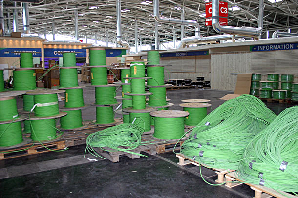 Aber nicht nur heißblütige Kommentatoren, sondern auch die geballte Technik im IBC sorgen für massive Wärmeentwicklung, der man mit umfassender, zusätzlicher Klimatechnik in den Messehallen zuleibe rückt. Temperatur ist auch ein wichtiges Thema für die Sicherheitsexperten: Aufgrund der Holzbauweise des IBC forderte etwa der Brandschutz zunächst den Einbau von Sprinkleranlagen. Eine Anforderung, die jedem Techniker den Schweiß auf die Stirn treibt, wenn er sich vorstellt, dass eventuell ein illegal rauchender Mitarbeiter die Sprinkleranlage im benachbarten Technikraum auslösen könnte. Die Vorstellung, dass Equipment unwiederbringlich von einer irrtümlich ausgelösten Sprinkleranlage zerstört und ein großflächiger Stromausfall provoziert wird, ist sehr unangenehm. Also musste eine andere Lösung her: Man entschied sich, in den wichtigen, zentralen Technikräumen den Sauerstoffgehalt soweit zu reduzieren, dass dadurch ein gewisser Feuerschutz erfüllt ist, außerdem ist in diesen Bereichen die Raumtemperatur auf 15 Grad Celsius abgesenkt. In den solchermaßen ausgewiesenen Räumen entspricht der Sauerstoffgehalt nun dem eines Niveaus von 3.000 m — was wiederum dazu führt, dass sich nur medizinisch dafür für tauglich befundene Mitarbeiter für maximal drei Stunden am Stück in diesen Technikräumen aufhalten dürfen.
