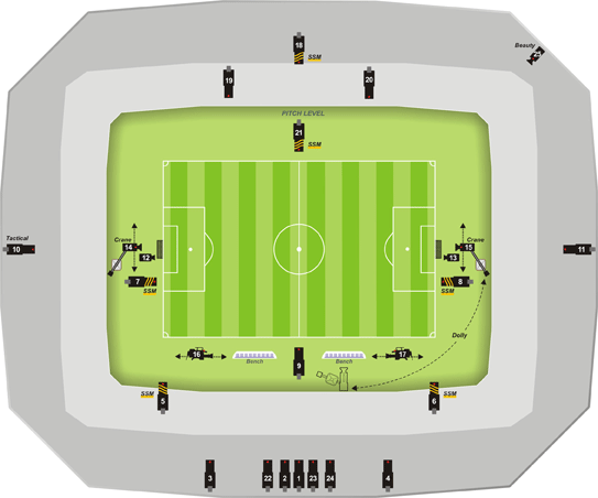 Die TV-Dienstleister von HBS setzen in den Stadien für die Produktion der Spiele je 25 HD-Kameras ein, die neben dem Geschehen auf dem Spielfeld auch die Trainerbank und die Publikumsränge erfassen. Sechs dieser 25 HD-Kameras sind Slow-Motion-Kameras, kabellose HD-Kameras werden in den Stadien nicht eingesetzt. Hinzu kommt jeweils noch eine im Stadion fest eingebaute »Roof-Cam«, die einen kompletten Überblick von oben bietet. Zum Vergleich: Selbst bei den ebenfalls schon extrem aufwändig produzierten Champions-League-Endspielen wurden bislang maximal 22 Kameras eingesetzt.